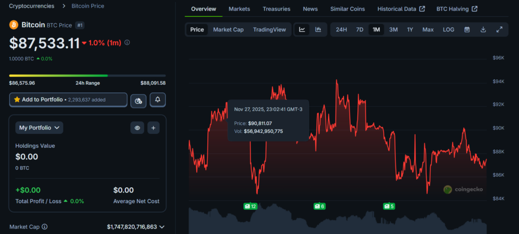 • Acúmulo Institucional (DATs): As Tesourarias de Ativos Digitais (DATs) aproveitaram a queda para acumular 42.000 BTC em dezembro, elevando suas posses para mais de um milhão de unidades.
